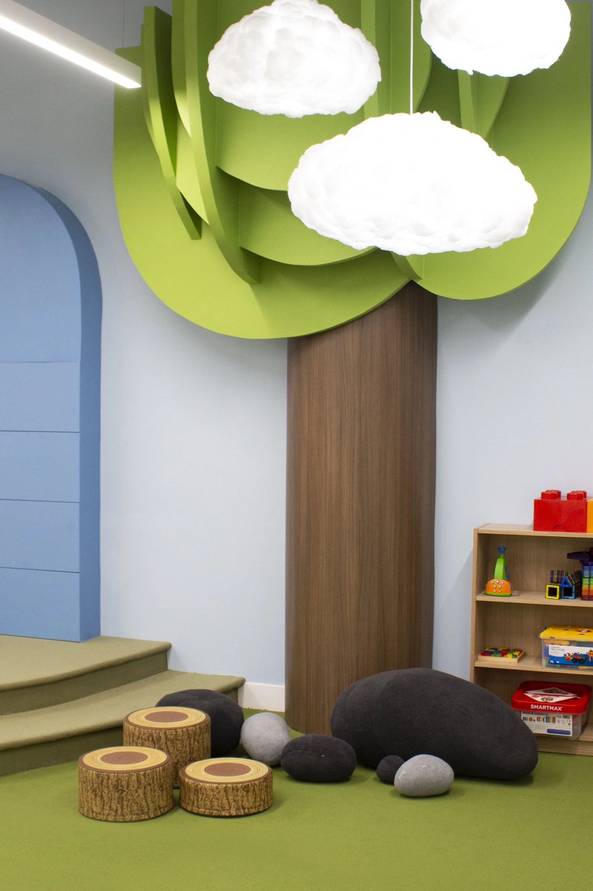 Inspired by Swedish interior design, white-stained oak flooring and cabinetry along with off-white walls allowed controlled, minimal branding colors to highlight key areas. The soft, natural shell provides a calm palette for 12’ tall beams, storage containers, toys, and play areas are the main focal points. Natural light from unobstructed windows make the space bright, open, and airy.